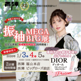 12月の振袖 MEGA BIGフェア開催のお知らせです!✨ 今回は、西陣 福山本店にて 12/21(日)~12/23(火)の3日間 10:00~18:…