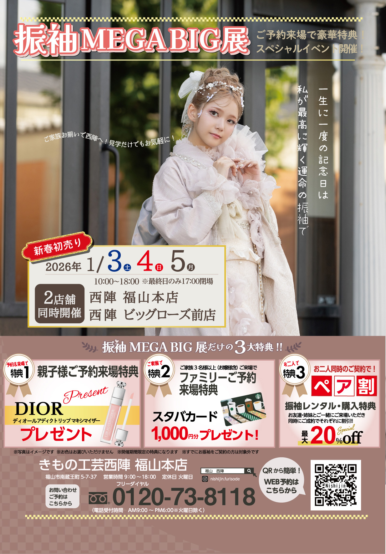 新年1月3日(土)より5日(月)まで「新春初売り 振袖MEGA BIG展」を開催します。